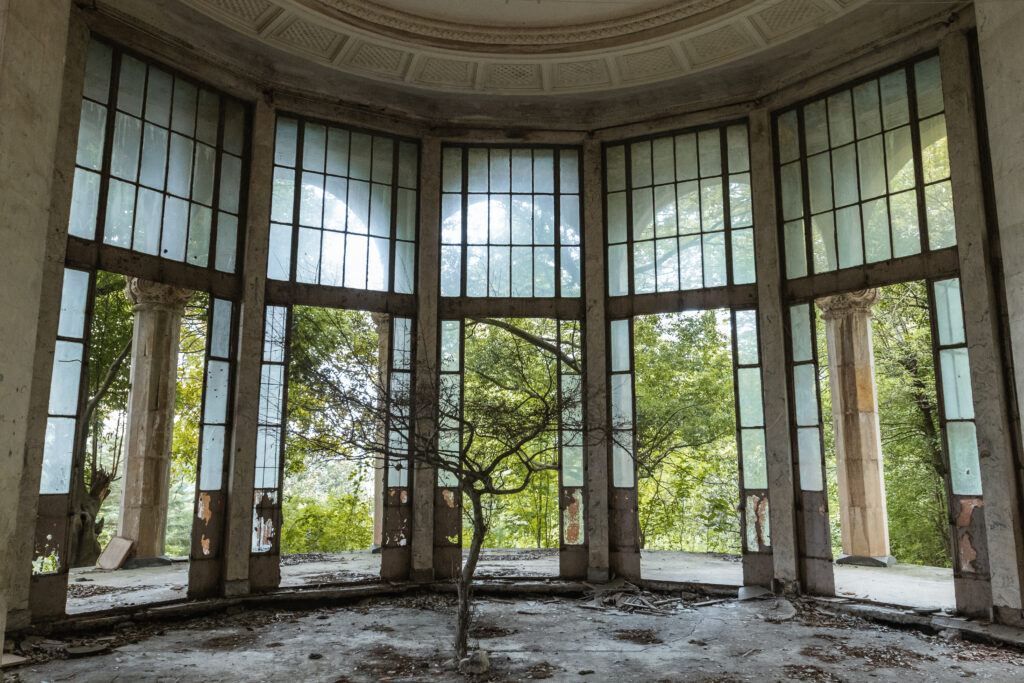 Former Hotel No. 2 and Stalin’s Dacha (KGB building) are reminders of Tskaltubo’s prestigious past. The hotel was once used by VIP visitors, while Stalin’s Dacha served as a secure retreat for high-ranking officials. Today, both buildings are abandoned, their crumbling walls and overgrown gardens offering a glimpse into the secrecy and grandeur of Soviet life.